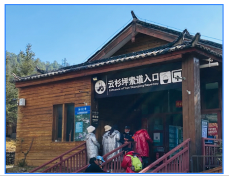 Take shuttle bus to Spruce meadow Cableway Station at Lijiang Xuechuan Tourist Rception Port.